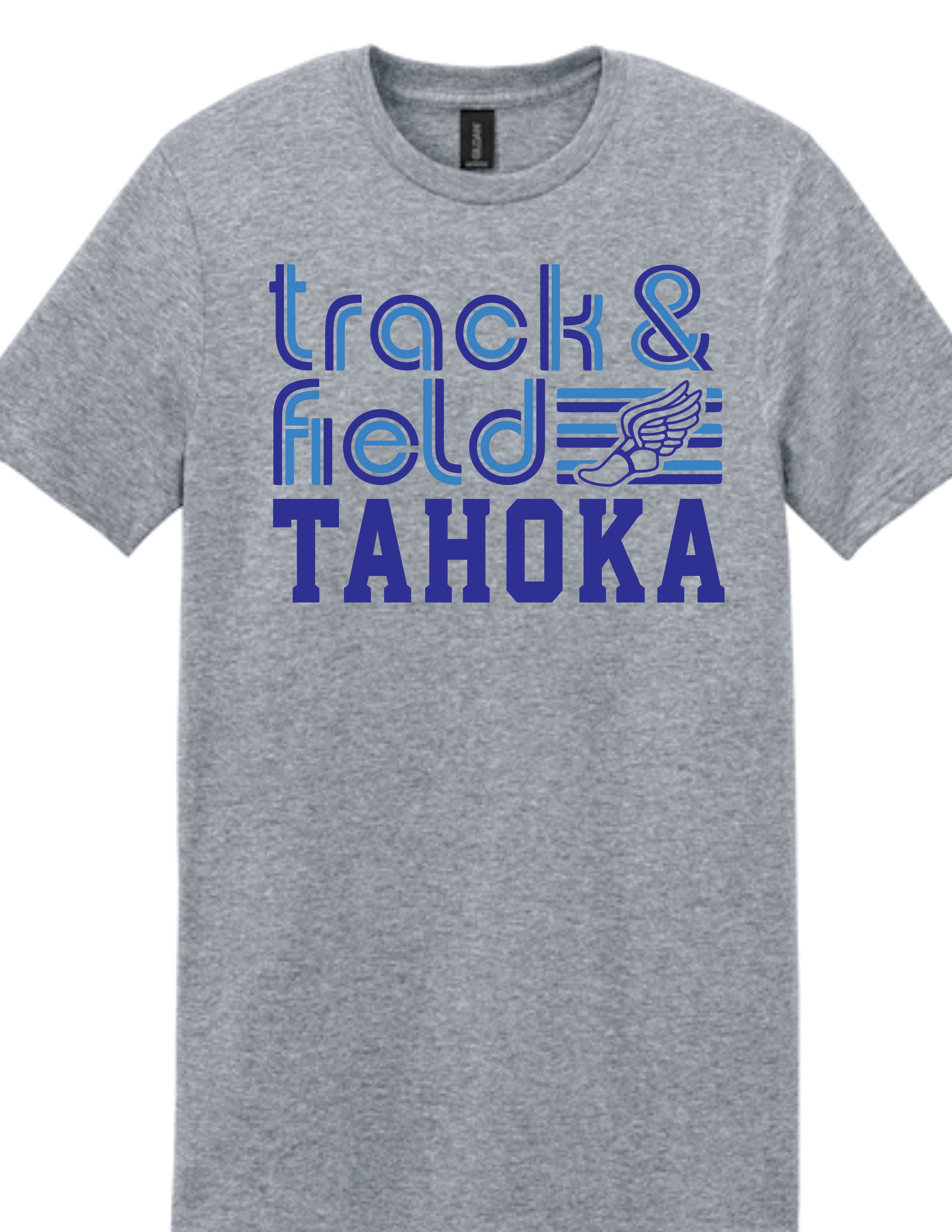 Sport Gray apparel with royal and columbia blue print. Available in cotton and dri fit options, short and long sleeve, sweatshirt and hoodie.